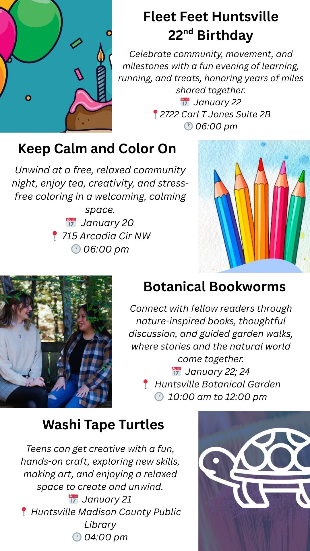 Fleet Feet hosts a birthday bash, garden book club returns, and a rare book collection hits the shelves. Also: MLK event at UAH, parenting classes at The Orion, and this week's pop-ups